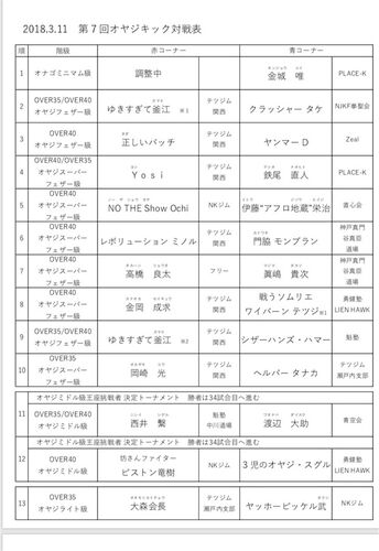お待たせしました。 対戦表発表です。 ※間違い等ありましたら、ご連絡下さい。 全35試合 参加して頂いた熱いオヤジ、オナゴ達に乾杯! オヤジキックホームページhttp://www.oyazikick.com/