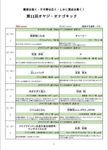 オナゴ1試合、大阪vs名古屋オヤジ対決、各階級タイトルマッチ含め48試合。 ※間違い、不備等ありましたらご連絡下さい。 オヤジ最強ブランド オヤジキック オヤジキックホームページ http://www.oyazikick.com/