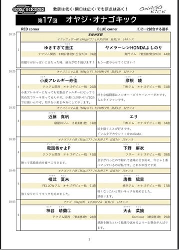 お待たせしました。 17回大会の対戦表です。 間違い等ありましたら、連絡ください。 怒涛の48試合 タイトルマッチ3試合、王座決定戦1試合。 第一試合開始時間は10時15分からです。 宜しくお願い致します。 大会注意点 宜しくお願い致します。 オヤジ・オナゴ…