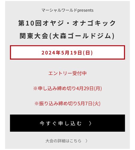 関東大会のエントリー締切日は4月29日となります。 皆様のエントリーおまちしております。 エントリーはこちらから ↓ https://www.oyazikick.com/ 関東大会お知らせ第1弾! オヤジヘビー級王座決定戦が決定! 髙木昭彦(蒼龍会館金剛カラテ神奈川湘南支部)…