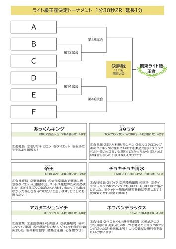 お待たせしました。 第14回オヤジ・オナゴキック対戦表発表です。 ※間違いがありましたら、ご連絡下さい。 オヤジバンタム級タイトルマッチ オヤジS.ウェルター級タイトルマッチ オヤジS.フェザー級王座決定戦 オヤジフェザー級次期挑戦者決定戦 オヤジライ…
